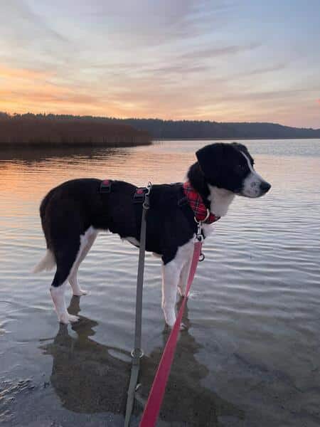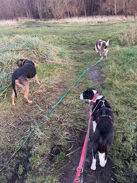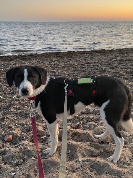 Sie läuft hervorragend an der Leine und bewegt sich draußen recht sicher und ist interessiert. In der Natur beobachtet sie viel, schnüffelt manchmal ausgiebig und ist wenig schreckhaft.