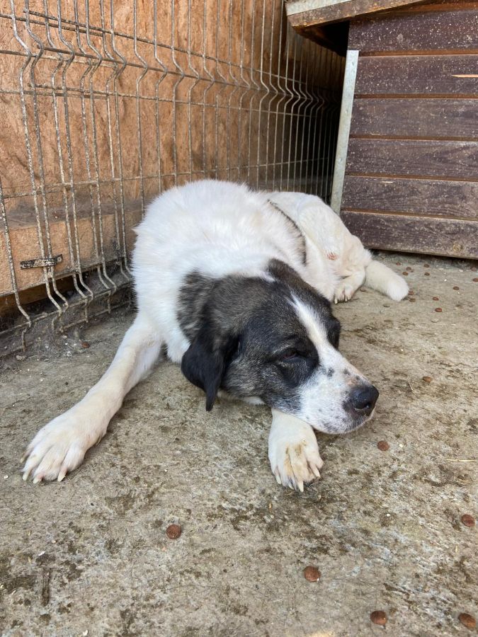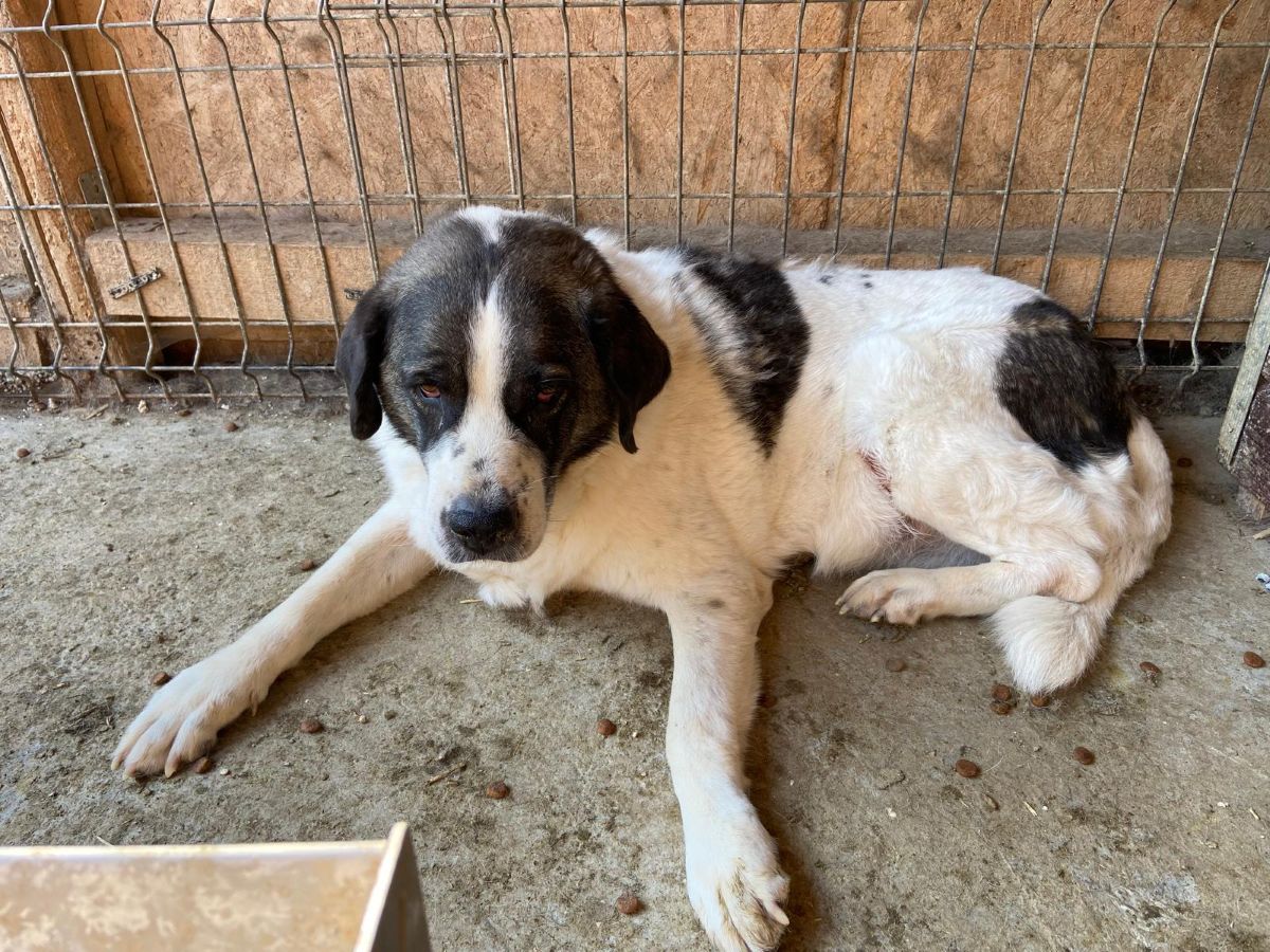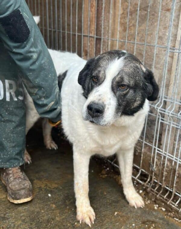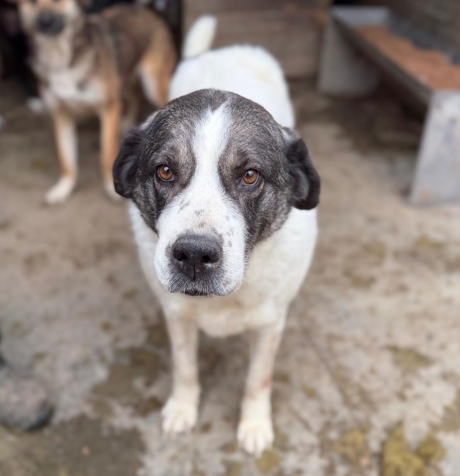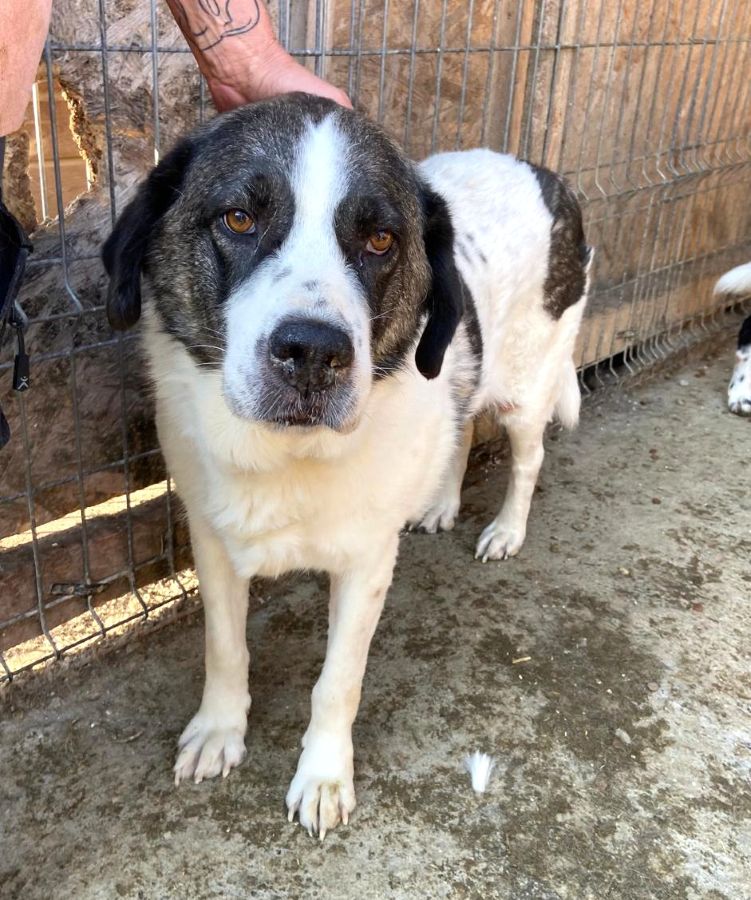 Am Zaun begrüßte uns diese wunderbare Hündin bereits. Ihr Kopf und ihre Statur erinnerte uns an einen Bernhardiner. Sie wird schon sehr viel in ihren Leben erlebt haben. Ihr Körper sieht aktuell wahrscheinlich älter aus als sie tatsächlich ist. Ihre Zähne sahen soweit O.K. aus. Viel zu dünn und kaum Muskeln an der Hinterhand. Kein Wunder, dass sie aktuell nicht gut zu Fuß ist. Leichtes Aufbautraining im eigenen Garten würden ihr helfen. In der Gruppe zeigte sie sich sehr verträglich. Dürfte aber in einem ebenerdigen Zuhause mit Garten auch als Einzelhund glücklich werden. Sie liebt den Menschen und lässt sich gerne und überall anfassen. Nun müssen ihre Menschen sie nur noch sehen.