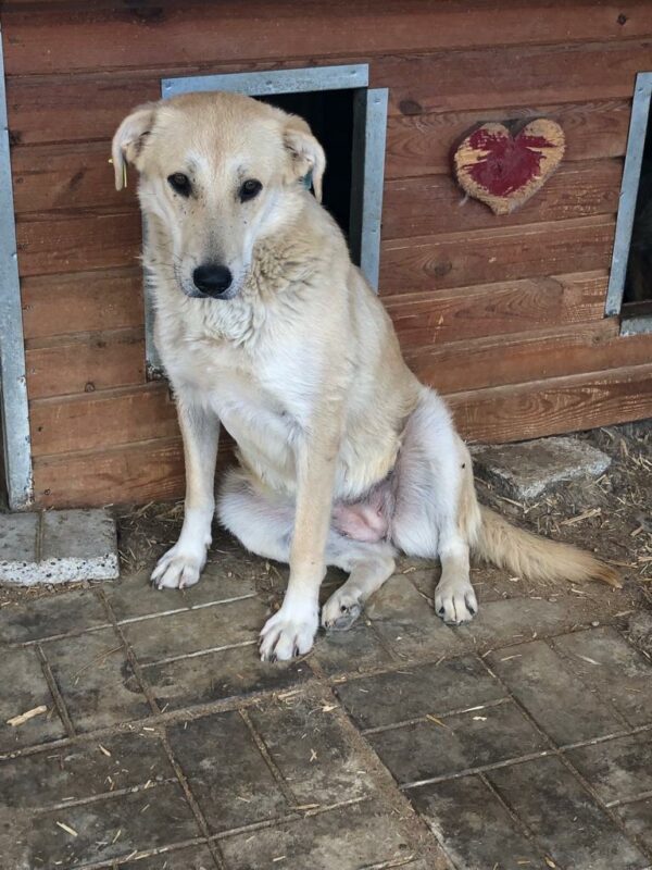 GODIVA nahm auch diesmal wieder gern Leckerlis aus der Hand. In der Hütte konnten wir sie unter Bedrängung auch anfassen. GODIVA ist eine zurückhaltende Hündin, die in einer anderen Umgebung bei sehr erfahrenen Menschen nach Eingewöhnungszeit sicherlich zutraulich werden würde.