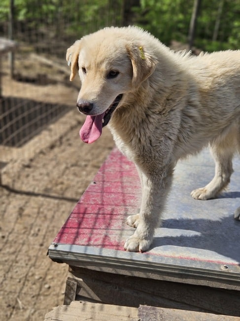 Der süße GOMEZ sieht aus wie ein Plüschteddy. Er freute sich sehr über unseren Besuch. GOMEZ lebt quasi auf den Hüttendächern und hat dort, vor dem Gewusel der anderen Junghunde, einen Rückzugsort. Als wir uns ihm zuwandten, nahm er gerne unsere Leckerchen und wir konnten ihn dabei an der Schnauze berühren. Wahrscheinlich hat er Streicheleinheiten nie kennengelernt und so überspielte er seine Unsicherheit mit Spielaufforderungen. In einer anderen Umgebung würde dieser letzte Schritt des fehlenden Vertrauens schnell überwinden sein. Seine offene, neugierige Art werden ihm dabei helfen.