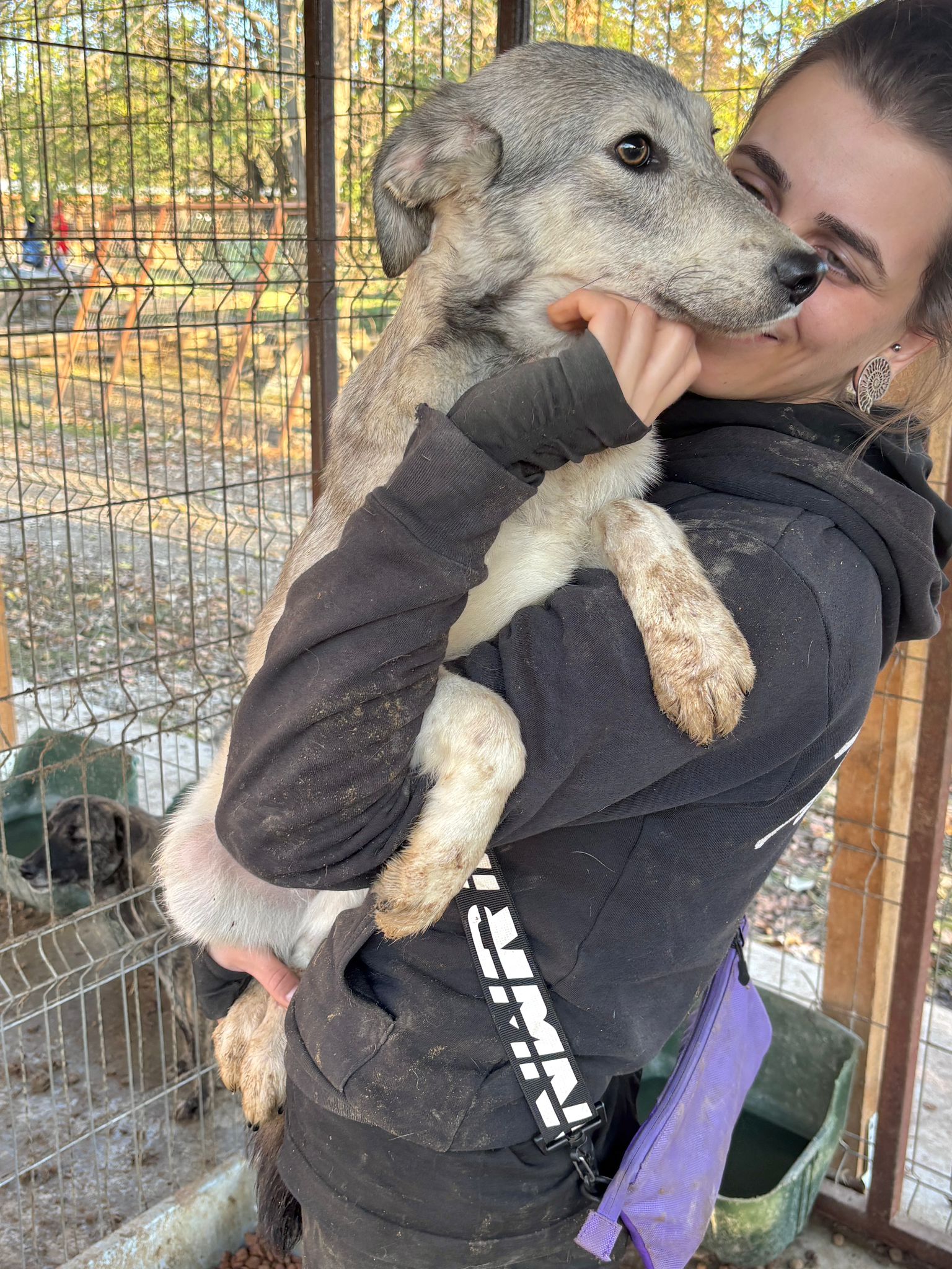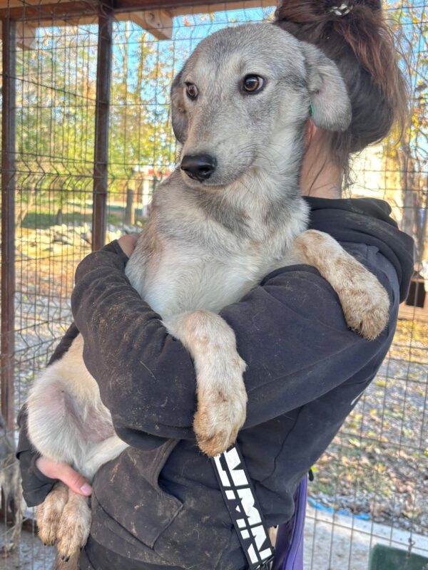 Bei diesem Besuch war er ganz aufgeregt über die seltene Abwechslung und wuselte gemeinsam mit den anderen Junghunden seines Kennels um uns herum. Immer wieder kam GRIGIO zum Schnuppern an die Hand, doch zu mehr Kontakt traute er sich von allein nicht so recht. Im Vorbeilaufen konnten wir ihn schließlich halten und behutsam streicheln. Auf dem Arm hielt er ganz still, als könne er kaum glauben, dass ihm diese Zuwendung gerade zuteil wird.