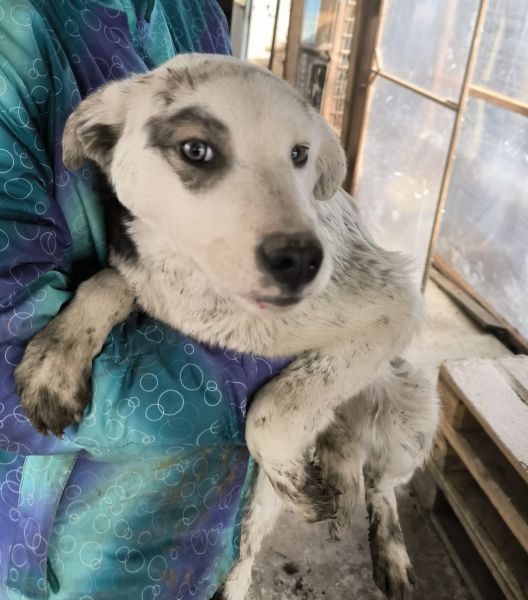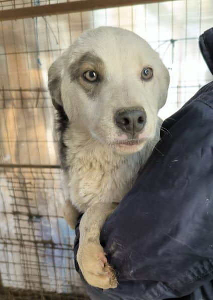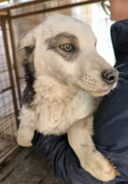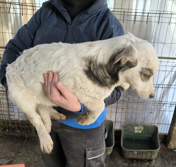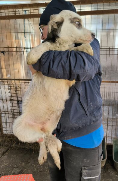 Diese junge Hündin ist in ihrem jungen Alter leider schon unsicher gegenüber Menschen. Man merkt ihr deutlich an, dass sie fast noch nie etwas mit Menschen zu tun hatte. Trotzdem ließ sie sich tapfer und ohne Abwehrverhalten auf den Arm nehmen und überall anfassen. Genießen konnte sie es nicht, aber sie ließ es unter Anspannung über sich ergehen. Als wir sie wieder auf dem Boden absetzten, ging sie zielstrebig in ihr Versteck hinter der Hütte zurück, um bei ihren ebenso unsicheren Geschwistern Schutz zu suchen. Für diese junge Hündin sollte sich zeitnah eine Lösung finden, um sie mit Liebe, Geduld und vielen positiven Momenten aus ihrer Unsicherheit herauszuholen.