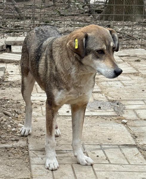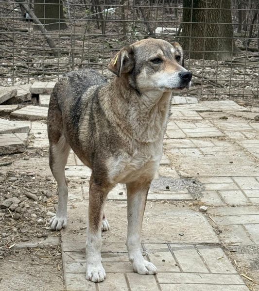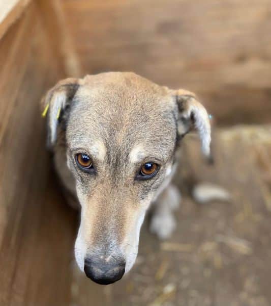 Diese Hündin lebt bereits seit mindestens vier Jahren im Shelter. Trotz ihrer langen Zeit vor Ort begegnete sie uns neugierig und offen, beobachtete uns interessiert und nahm Leckerli vom Boden. Vielleicht hätte sie sich noch mehr getraut, wenn sie nicht ein Kennelgenosse gestört hätte. Noch fehlt ihr der Mut, aktiv auf Menschen zuzugehen, doch in ihrer Hütte ließ sie sich nach anfänglicher Skepsis vorsichtig streicheln – ein schöner Schritt in die richtige Richtung.