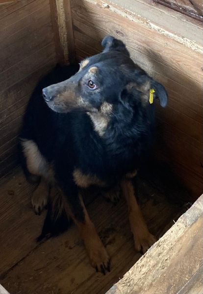 Diese Hündin hielt sich bei unserem Besuch nur in ihrer Hütte auf. Dort war sie vorsichtig anfassbar, hielt die für sie ungewohnten Berührungen jedoch eher aus, als dass sie sie genießen konnte. Dabei zeigte sie ein defensives Verhalten, ohne in Panik zu geraten.