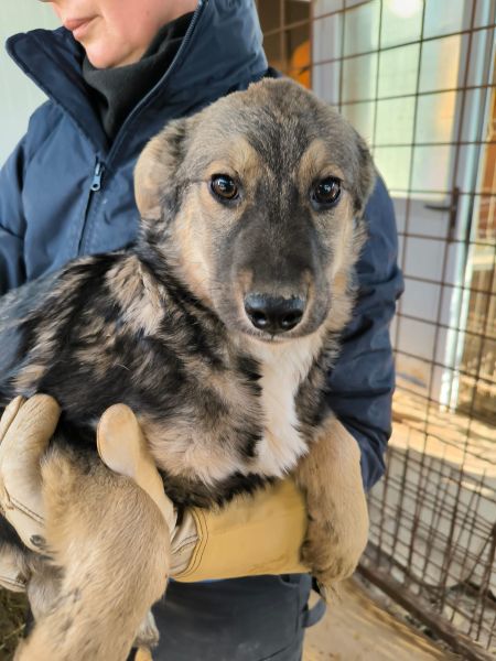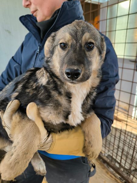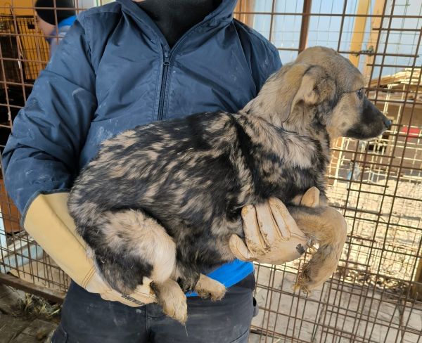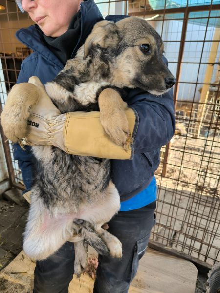 Diese junge Hündin ist leider bereits etwas scheu. Sie versteckte sich vor uns hinter der Hütte. Dort konnten wir sie nur unter Bedrängung und mit Abschnappverhalten hervorholen. Als sie merkte, dass sie aus der Situation nicht herauskommt, ließ sie es nahezu anstandslos über sich ergehen und sich auch auf den Arm nehmen. Genießen konnte sie es nicht und sie stand unter Anspannung. Als wir sie wieder auf dem Boden absetzen, schaffte sie sofort einen Sicherheitsabstand zu uns und suchte Schutz bei ihren ebenso unsicheren Geschwistern hinter der Hütte. Für diese junge Hündin suchen wir zeitnah eine Lösung, um sie mit Liebe, Geduld und vielen positiven Momenten aus ihrer Unsicherheit herauszuholen.