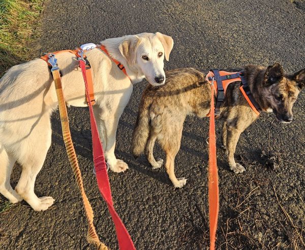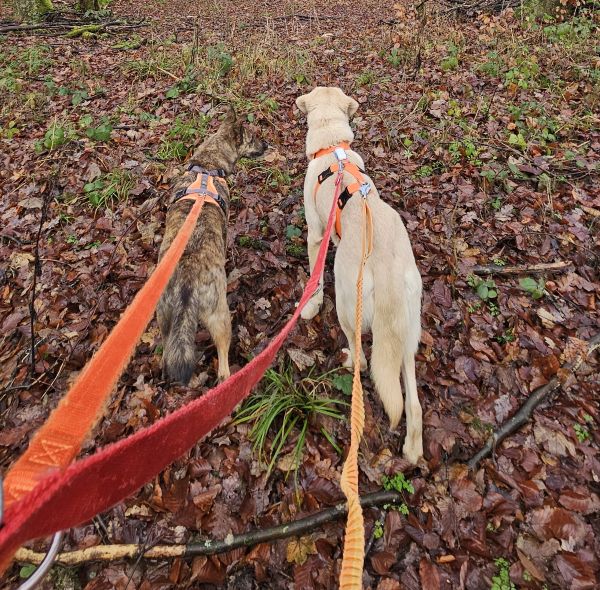 Die täglichen Routinen – Fütterungszeiten, Spaziergänge – tun ihm sichtlich gut. Hans geht gerne spazieren und macht das richtig gut. Er läuft entspannt an der Leine (auch hier ist ihm unsere Hündin ein Vorbild), wenn er allerdings eine Witterung aufnimmt, kann er mächtig ziehen. Hin und wieder zeigt er eine leichte Tendenz, nach Radfahrern, Joggern etc zu schnappen, daran arbeiten wir.