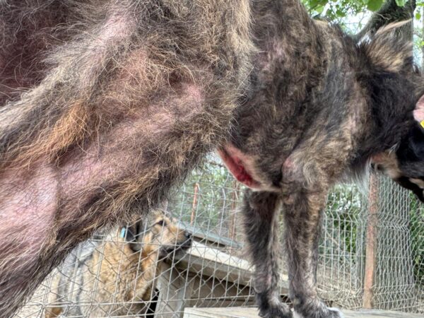 Wir haben ihn bei unserem Mai Einsatz noch einmal besucht. Die Kennel Situation ist schwierig, er liegt wie eh in seiner Hütte, die letzte in der Reihe. Als HERMAN uns bemerkte und wir ihm ein paar Leckerli gaben, kam er neugierig heraus und hat uns eine ganze Frolic Tüte vor Hunger leer gefressen. Die Hautprobleme sind noch schlimmer geworden. HERMAN kratzt sich die ganze Zeit, sein Bauch ist bereits wund gekratzt. Ansonsten ist er ein lieber Kerl, der sich auch gern von uns streicheln ließ.