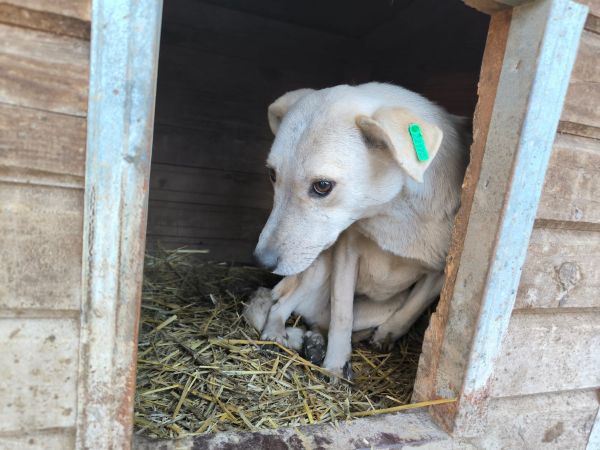 Hevin befindet sich nun auch in einem Außenkennel. Sie versteckte sich in der sicheren Hütte, als wir im Kennel waren. Von sich aus nahm sie keinerlei Kontakt zu uns auf. Als wir sie in der Hütte bedrängen wollten, flüchtete sie und vermied es, sich erneut in unserer Anwesenheit in einer Hütte zu verstecken. Außerhalb der Hütte war es uns kaum möglich, sie anzufassen, denn sie suchte stets das Weite oder versteckte sich in einem kaum erreichbaren Eck im Kennel.