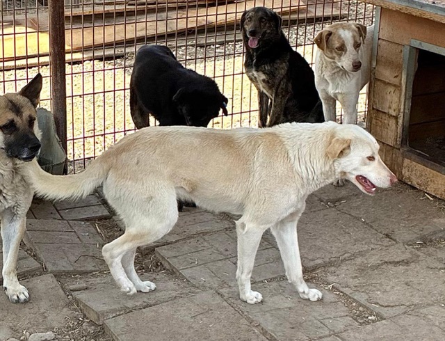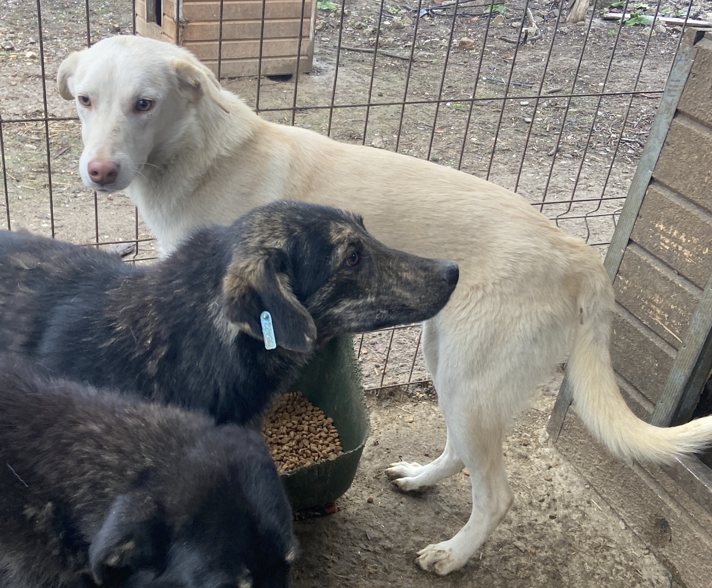 ICEMAN nutzte die Gelegenheit einer offen stehenden Kenneltür und verbrachte ein paar Tage außerhalb seines Kennels. Er und seine ihm Sicherheit gebende Freundin LUANA hielten sich immer in unserer Nähe, bzw. in der Nähe des ursprünglichen Kennels auf. Er war vorsichtig, aber nicht panisch, war sehr darauf bedacht, nicht zu verpassen, wenn es Leckerchen gab. Ein paar Mal schaffte er es, sie aus der Hand zu nehmen, sicherer erschien es ihm im Moment jedoch vom Boden. Die drei Tage „Ausflug“ ließen ihn etwas sicherer werden. Den anderen in dem Areal freilaufenden Hunden begegnete er mit gesunder Rücksicht und Respekt, so vermied er jeden Ärger. Inzwischen ist er wieder in seinem Kennel. Wir denken, dass er in anderer Umgebung eine gute Chance hat, ein netter, freundlicher hundischer Begleiter zu werden.