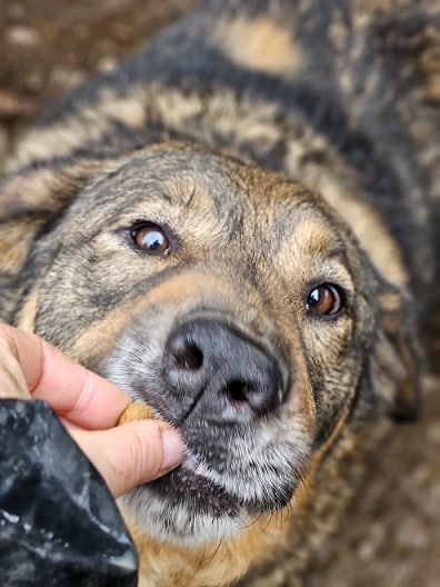 ISRA hat sich sehr über unseren Besuch gefreut. Dabei zeigte sie sich unaufdringlich und zunächst etwas unsicher, zugleich aber spürbar fröhlich und aufgeregt. Da ihr im Shelter der regelmäßige Kontakt zu Menschen fehlt, war ihre anfängliche Zurückhaltung gut nachvollziehbar. Dennoch nahm sie gerne Leckerchen an und genoss unsere Streicheleinheiten sichtlich.