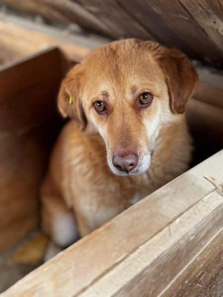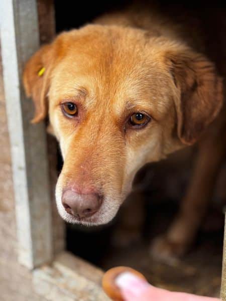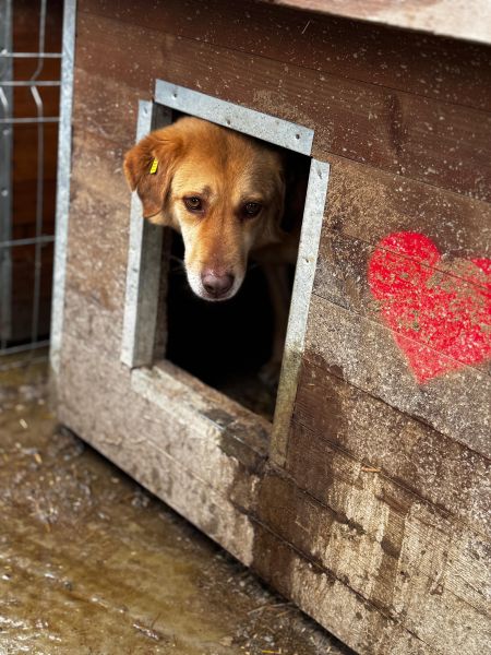 JANNI ist ein zurückhaltender Hund, der in seinem Kennel gemobbt wird. Er darf sich nicht frei bewegen, weil er dann direkt von einem anderen Hund gemaßregelt wird. Auch zum Futter wird er nicht gelassen, daher ist er aktuell auch viel zu dünn. JANNI nahm in der Hütte Leckerlies aus der Hand, anfassen konnten wir ihn leider nicht.