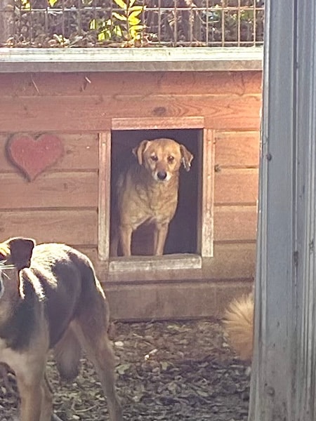 Johanny ist leider weiterhin kein Freund von Fremden in seinem Kennel, er drohte uns aus der Hütte heraus. Als wir aus dem Kennel gingen, kam er sofort raus und ging uns nach.