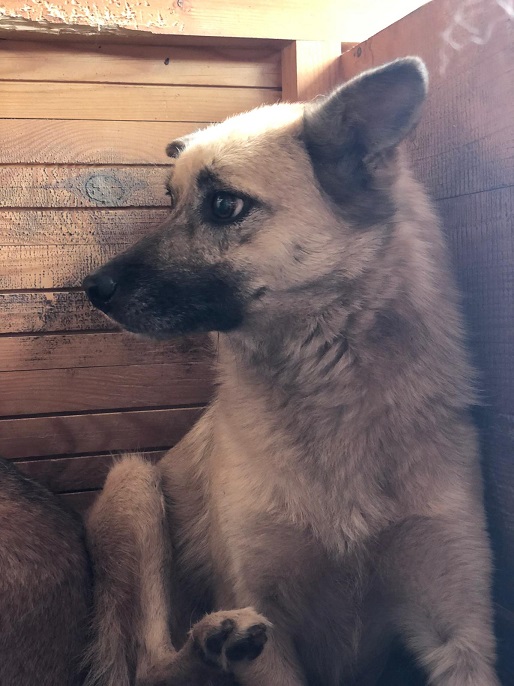 Die kleine JONA blieb die ganze Zeit während unseres Besuches lieber in der Hütte. Bei geöffnetem Hüttendach konnten wir sie behutsam streicheln. Es war sichtlich ungewohnt und etwas gruselig für sie, aber sie ließ es tapfer geschehen, ohne Abwehrreaktionen zu zeigen. Auch als wir den anderen Hund in der Hütte streichelten, blieb sie in ihrer Ecke sitzen und flüchtete nicht, obwohl die Möglichkeit gegeben war. Leckerlie mochte sie in unserer Gegenwart nicht naschen. Zu sehr konzentrierte sie sich darauf, uns aufmerksam mit ihren süßen Kulleraugen zu beobachten. JONA ist eine sehr schüchterne kleine Hündin, die bei Berührungen unter Bedrängung absolut defensiv blieb. Sie kennt das Zusammenleben mit Menschen einfach nicht, denn von ihren sechs Lebensjahren hat sie bereits unvorstellbare fünf im Shelter verbracht… Mit den anderen Hunden im Kennel scheint sie verträglich. Wir suchen für die kleine zarte JONA einen ruhigen und liebevollen Platz bei erfahrenen Menschen, die wissen, wie man die Eingewöhnungszeit für die süße JONA gestalten sollte, damit sie in ihrem Tempo ankommen und aufblühen darf. Ein souveräner Ersthund, an dem sie sich orientieren kann, wäre optimal.