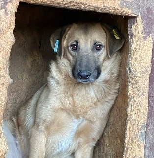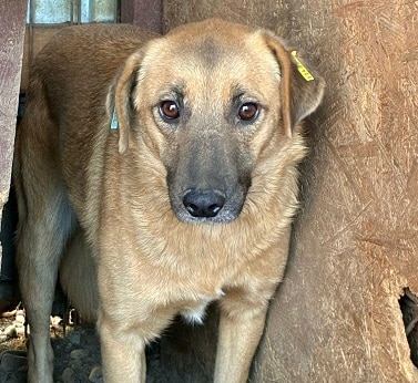 Dieser junge Rüde hielt sich während unseres Besuchs in der sicheren Hütte auf. Unsere Anwesenheit gruselte JUBILEE – in seinem kurzen bisherigen Leben wird er wohl nur kaum oder gar schlechte Erfahrungen mit Menschen gesammelt haben, weshalb er uns nicht traute. Als wir uns ihm näherten, um Leckerlie in die Hütte zu legen und ihn zu berühren, zeigte JUBILEE uns seine Angst deutlich durch Knurren. Was muss diese zarte und noch so junge Hundeseele bisher bereits erlebt haben, dass eine Hand ihr solche Angst macht…?