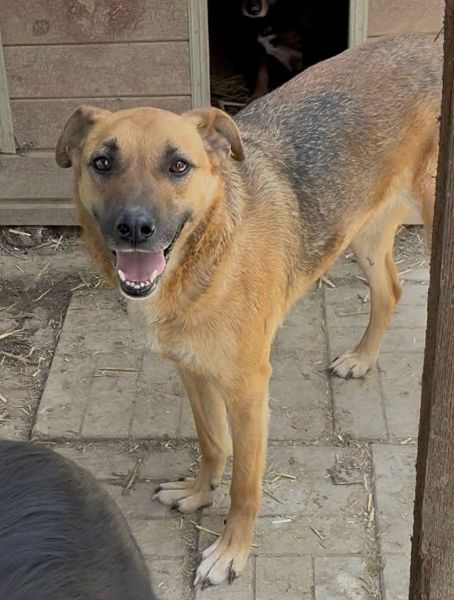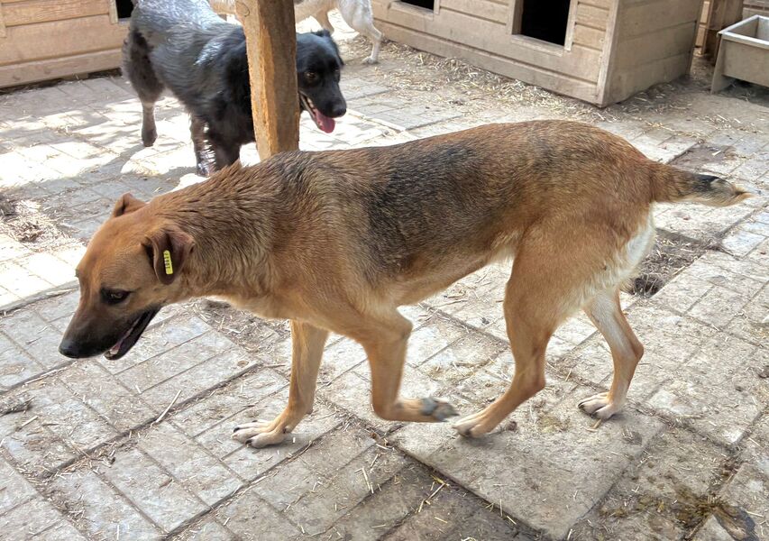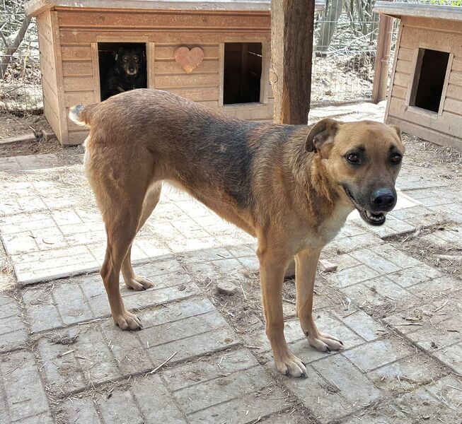 Der freundliche JULJEN beobachtete uns zunächst nur aus der Hütte heraus. Dann siegte die Neugier und er kam nachsehen, was wir so treiben. Er nahm gut Leckerlis aus der Hand und ließ sich dann auch streicheln. Ein netter Rüde, der sicher schnell auftauen wird.