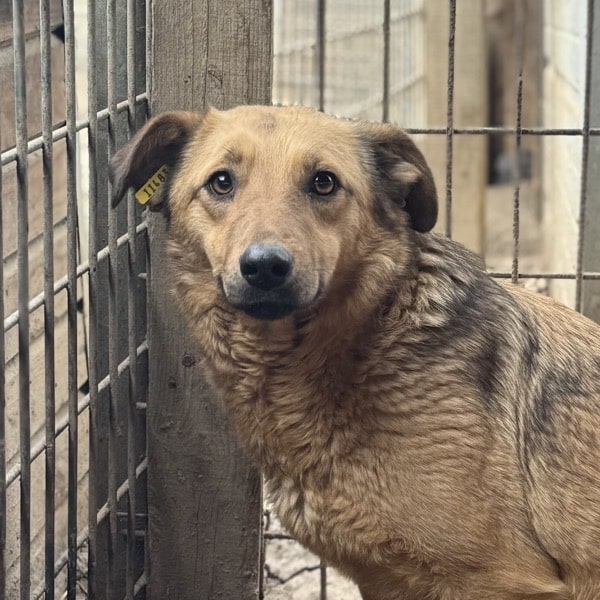 Diese zarte, junge Hündin hielt sich während unseres Besuchs in der sicheren Hütte auf. Unsere Anwesenheit gruselte KANDRA – in ihrem jungen Leben wird sie bisher nur kaum oder gar schlechte Erfahrungen mit Menschen gesammelt haben, weshalb sie uns nicht traute. In der Hütte konnten wir KANDRA behutsam überall anfassen, doch diese Nähe ist neu und deshalb ungewohnt für sie, weshalb sie mit dieser Zuwendung noch nicht viel anfangen kann und dabei etwas versteinert.