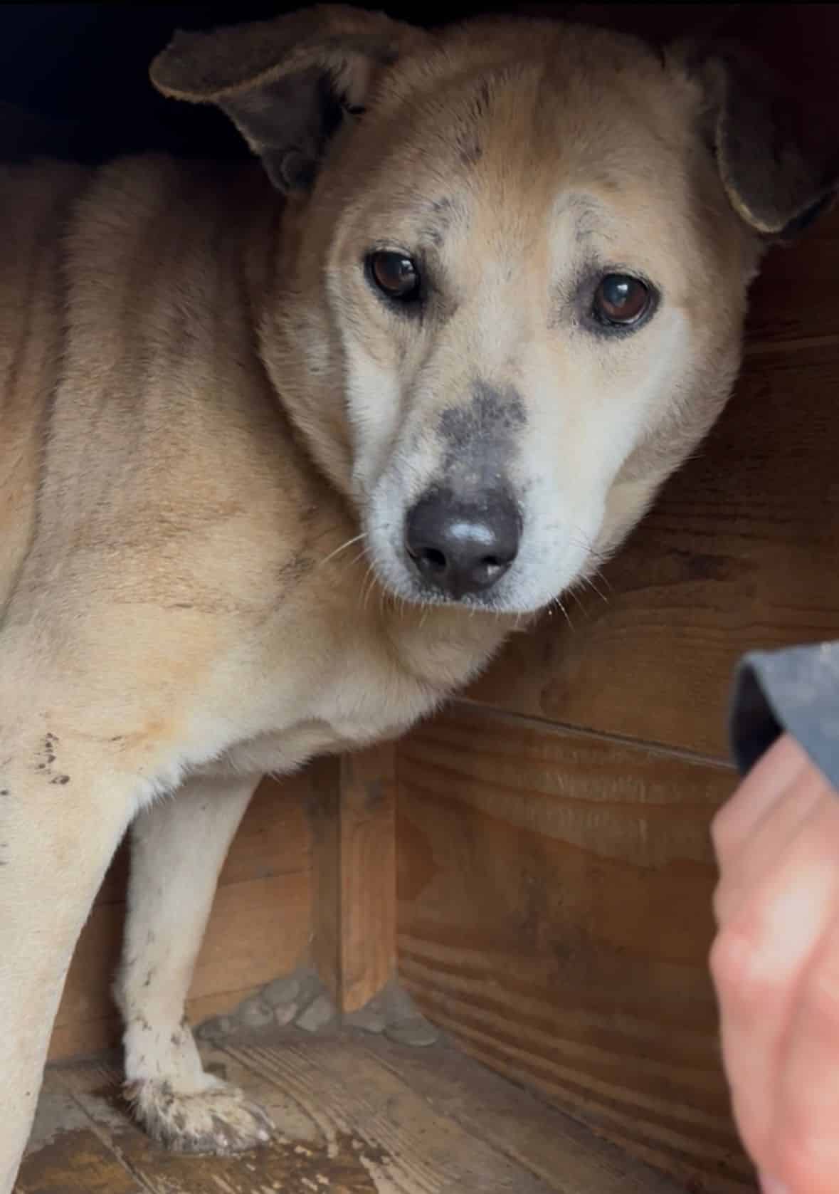 Seit nun bald 8 unvorstellbar langen Jahren hofft unser KASIO vergeblich im riesigen Shelter auf seine Chance und musste dort sichtlich alt werden. Der einst so agile Bub sah bei diesem Besuch sehr mitgenommen aus: stumpfes Fell, Liegeschwielen, wunde Stellen am Körper und fehlende Zähne. Auch diesmal nahm er gern die mitgebrachten Leckerlie aus der Hand und zeigte sich generell sehr neugierig und interessiert an uns. In der sicheren Hütte konnten wir KASIO problemlos streicheln. Diese intensive Nähe ist neu und daher noch ungewohnt für ihn, doch er machte es ganz brav mit. So viel kostbare Lebenszeit hat KASIO bereits im Shelter verloren und wir wünschen ihm so sehr, dass er wenigstens seinen Lebensabend in Geborgenheit verbringen darf. Wir hoffen, dass er von verständigen Menschen gesehen wird, die ihm das Zusammenleben auf der Sonnenseite zeigen. Damit er all seine Sorgen hinter sich lassen und endlich ankommen darf. Da ihm die Anwesenheit anderer Hunde Sicherheit gibt, wäre ein netter Ersthund sicher eine große Stütze für KASIO.