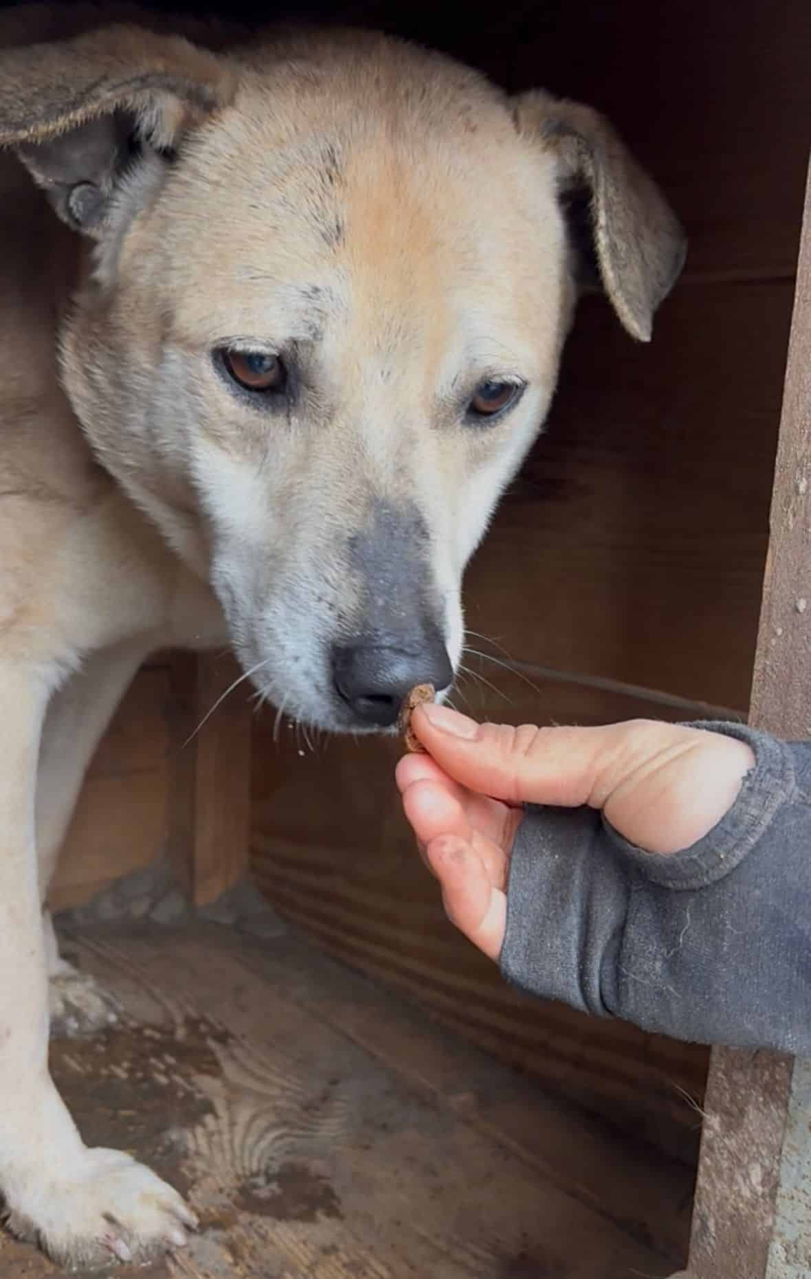KASIO nimmt Leckerlie aus der Hand und lässt sich vorsichtig an der Schnauze anfassen. Er hat leider seit dem Sommer Hautprobleme.