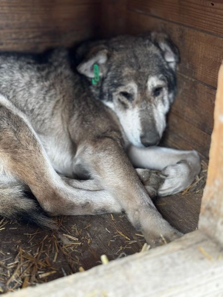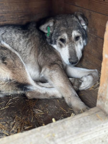 Keno ist ein schon älterer Rüde, der bei unserem Besuch nur in seiner Hütte lag. Er war unsicher uns gegenüber, aber keineswegs panisch. Er wirkt alt und abgekämpft und seine Augen sind entzündet. Wir konnten ihn in der Hütte anfassen und streicheln, dabei zeigte er kein Abwehrverhalten. Mit den anderen Hunden in seinem Kennel schien er gut zurecht zu kommen. Wir wünschen uns für ihn einen erfahrenen Platz, wo er noch einmal die schönen Seiten des Lebens erfahren darf.