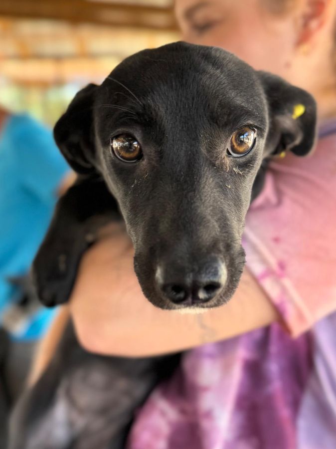 KIERA ist noch recht neu im Shelter und sitzt mit mehreren Welpen und Junghunden in einem Kennel.