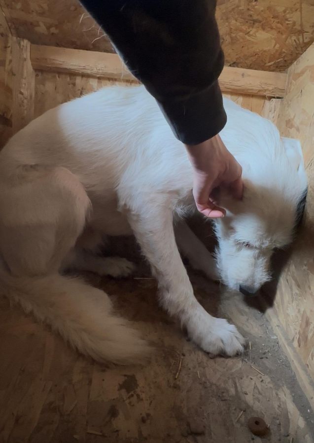 KIT lebt nun schon seit zwei Jahren gemeinsam mit seiner Mama Leni im Shelter, fast ohne Kontakt zum Menschen. Dementsprechend zeigt er sich bei Besuchen sehr schüchtern und ängstlich. Bei unserem Besuch lag er meiste Zeit zurückgezogen in seiner Hütte. Unter vorsichtiger Bedrängung lässt er sich mit der falschen Hand berühren, bleibt dabei jedoch unsicher.