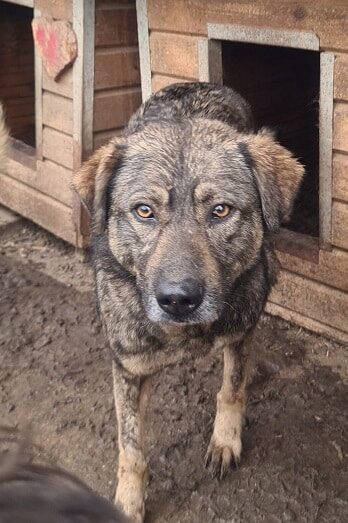 KLEIN VIOLA kam vorsichtig neugierig aus der Hütte, um zu schauen, wer wir sind und was wir in ihrem Kennel vorhaben. Wir konnten sie uns schnappen und festhalten, dabei blieb sie immer freundlich. Von allein kommt sie aber nicht zum Menschen.
