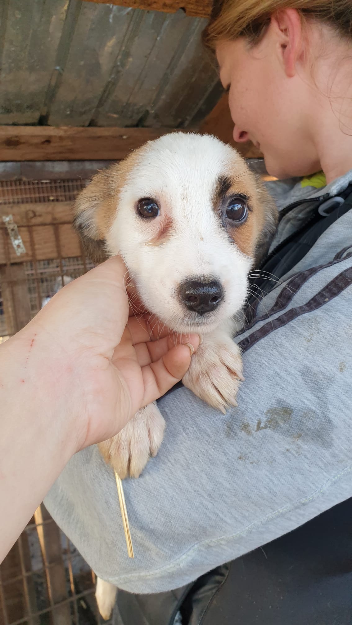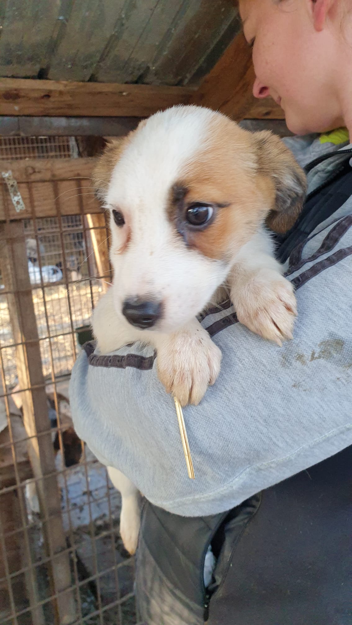 • sitzt mit 14 weiteren Welpen in einem kleinen Kennel