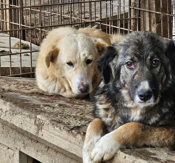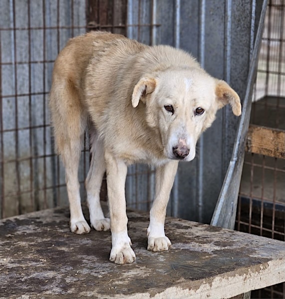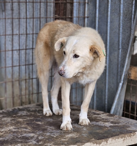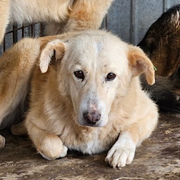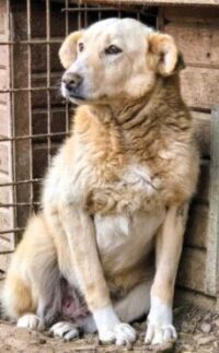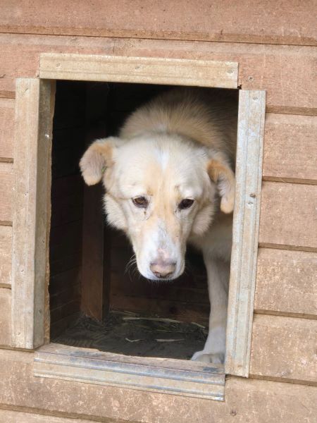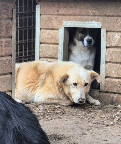 Lavinia haben wir auf einem Hüttendach vorgefunden. Hier scheint sie sich wohl zu fühlen, alles gut im Überblick. Die hübsche Hündin hielt sich bei unserem Besuch eher im Hintergrund. Wenn wir uns ihr nähern, weicht sie aus, ließ sich aber mit Körpersprache und der Hand von einer Flucht abhalten. Sie nahm auch Leckerchen vorsichtig vom Hüttendach. Angefasst werden wollte sie trotzdem nicht und wir wollten ihr das auch nicht zumuten. Ihr Gesicht ist von Narben gezeichnet, sie hat definitiv kein leichtes Leben gehabt und wirkt insgesamt resigniert. In ihrem Kennel hat sie ein wenig die Fürsorge für einen jüngeren unsicheren Rüden übernommen. Er hielt sich viel in ihrer Nähe auf, auch in Zukunft würde ihr Hundegesellschaft gut tun. Für Lavinia wünschen wir uns, dass sie endlich zur Ruhe kommen kann, bei Menschen, die ihr Zeit geben in ihrem Tempo anzukommen und nicht viel verlangen. Eine Decke, etwas Liebe und Verständnis, mehr braucht sie erstmal nicht zum glücklich sein.