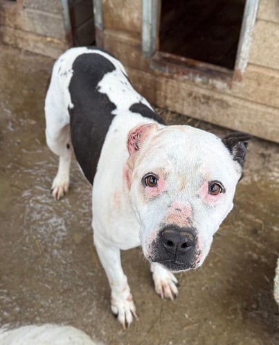 Die freundliche LAYNIE hat uns sehr berührt. Bei unserem Besuch fiel uns sofort auf, dass sie andauernd ihren Kopf schüttelt. Schnell war klar, dass ihre beiden Ohren total „dicht“ sind mit Verwachsungen und vermutlich auch stark entzündet. Wir haben die zuständige Tierärztin informiert, die als einzige Möglichkeit eine Operation in der Tierklinik sieht. Als Staff-Mix mit kupierten Ohren sind LAYNIE’s Chancen das Shelter jemals verlassen zu können leider äußerst gering, aber wenigstens die Operation wollen wir LAYNIE ermöglichen, damit sie wieder schmerzfrei leben kann.