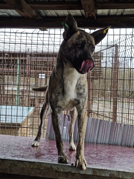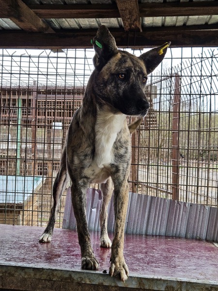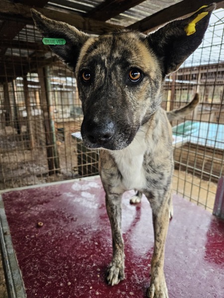 Leica und ihr Sohn sind gemeinsam in einen Außenkennel umgezogen. Hier hat die hübsche Hündin ihren Platz auf dem Hüttendach gefunden, sie scheint gern alles im Blick zu haben, auserdem konnte sie so besser unsere Aufmerksamkeit für sich gewinnen. Man merkt ihr an, dass sie mit der Situation im Shelter noch überfordert ist. Zuerst war Leica etwas skeptisch in unserer Anwesenheit, aber bereits nach ein paar Leckerchen taute sie auf. Leica nahm gern Leckerlis aus der Hand und ließ sich auch streicheln. Die Hündin, mit dem besonderen Aussehen, ist eher sensibler Natur. Das Shelter ist definitiv der falsche Ort für sie. Mit ihrem Sohn war ihr Umgang sehr liebevoll, ihre Zuneigung und Fürsorge für ihn konnten wir deutlich spüren.