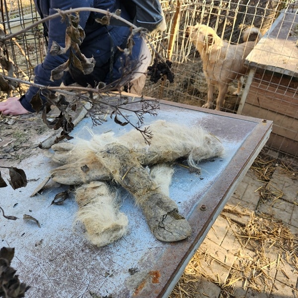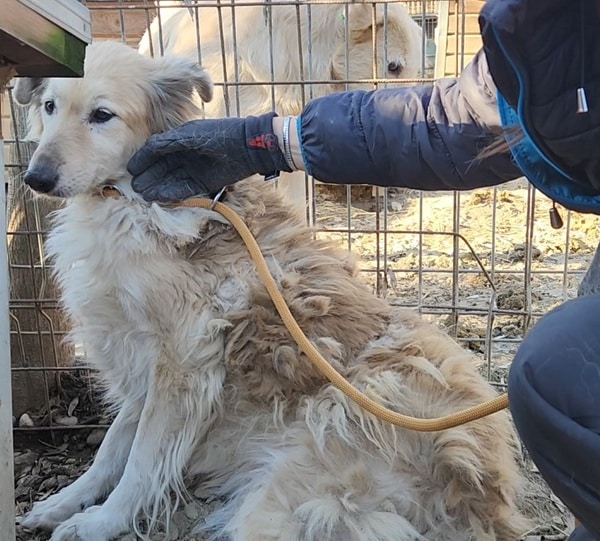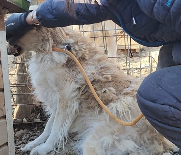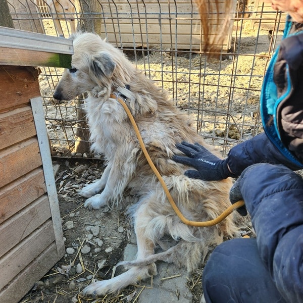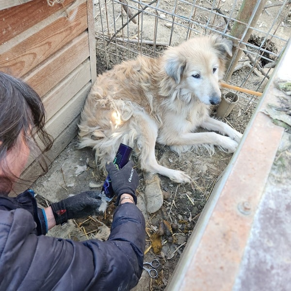 Unsere erfahrene Hundefriseurin Adele hat heute das Unmögliche möglich gemacht: beim Prüfen des Kennels ist ihr auch dieses Jahr wieder diese arme Hündin aufgefallen, ängstlich in der Ecke sitzend, wie man sie kennt. Schließlich gelang es ihr, sie vorsichtig mit der Hand zu berühren, was sie erstaunlicherweise gänzlich ohne Abwehrverhalten über sich ergehen ließ und dabei sehr ruhig blieb. Die Schermaschine gezückt, machte sie sich vorsichtig ans Werk und befreite sie in einem Kraftakt von der langjährigen, massiven Filzplatten von Rute und Bauch. Die um den Hals gelegte Leine schien ihr keine Angst einzuflößen, vielmehr hatte man den Eindruck, dass sie zunehmend Vertrauen zu ihr fasste. Ein ganz besonderes Erlebnis! Die beeindruckende Hündin ließ dies mit einer Ruhe über sich ergehen, als ob sie wüsste, dass dies ihre Chance auf Hilfe ist. Diese tolle Hündin hat damit einmal mehr bewiesen, welche sanfte Seele in ihr steckt und dass auch sie als jahrelang nicht anfassbar-geltende Langzeitinsassin eine echte Chance verdient!