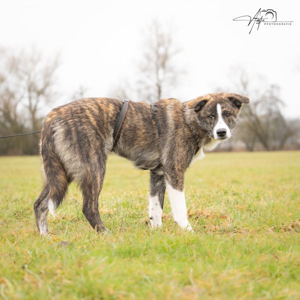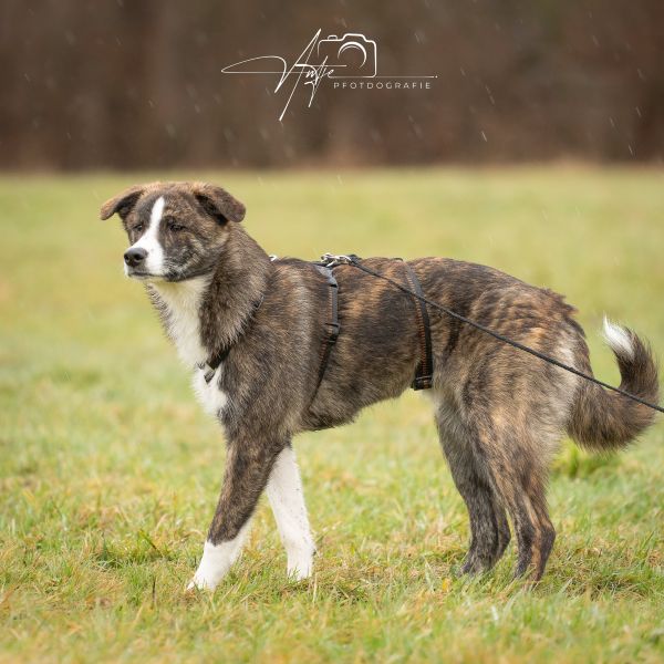 Sie tobt gerne im Garten, hat aber auch das Spazieren gehen für sich entdeckt. Sie ist die erste, die angerannt kommt, um sich ihr Geschirr anziehen zu lassen. Bei lautem Straßenverkehr ist sie aber noch etwas ängstlich.