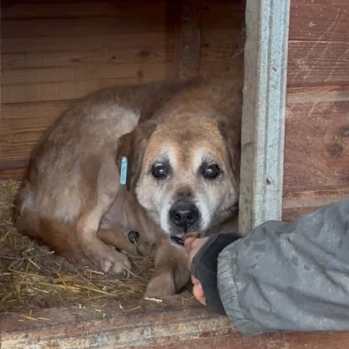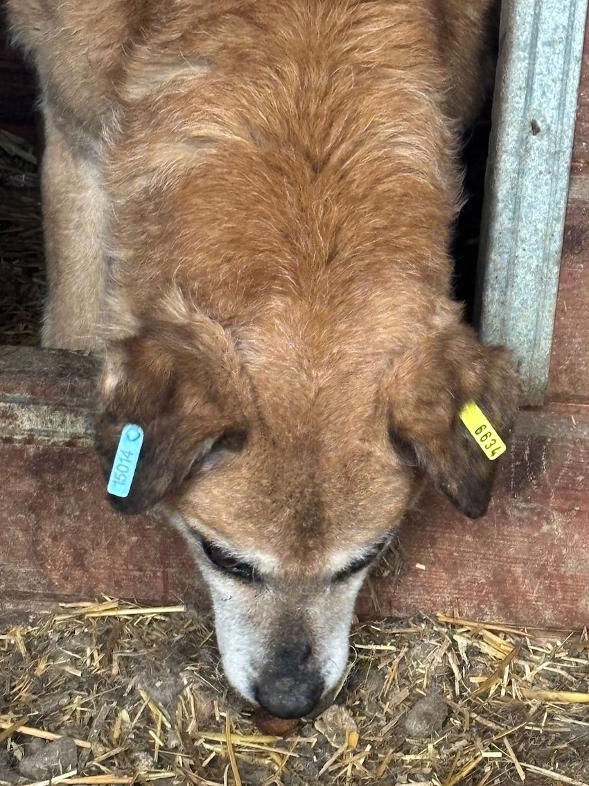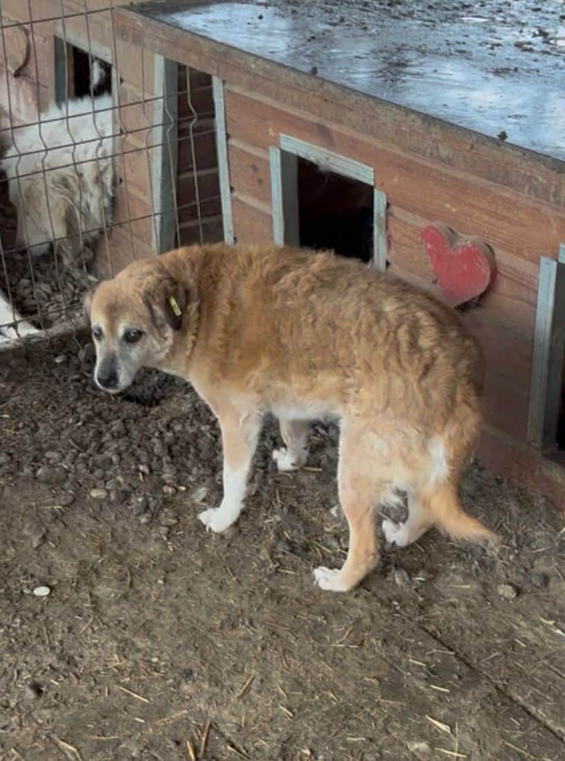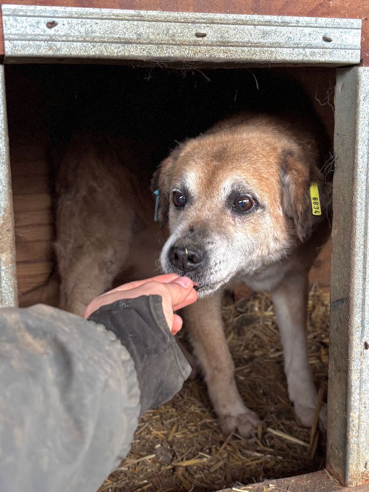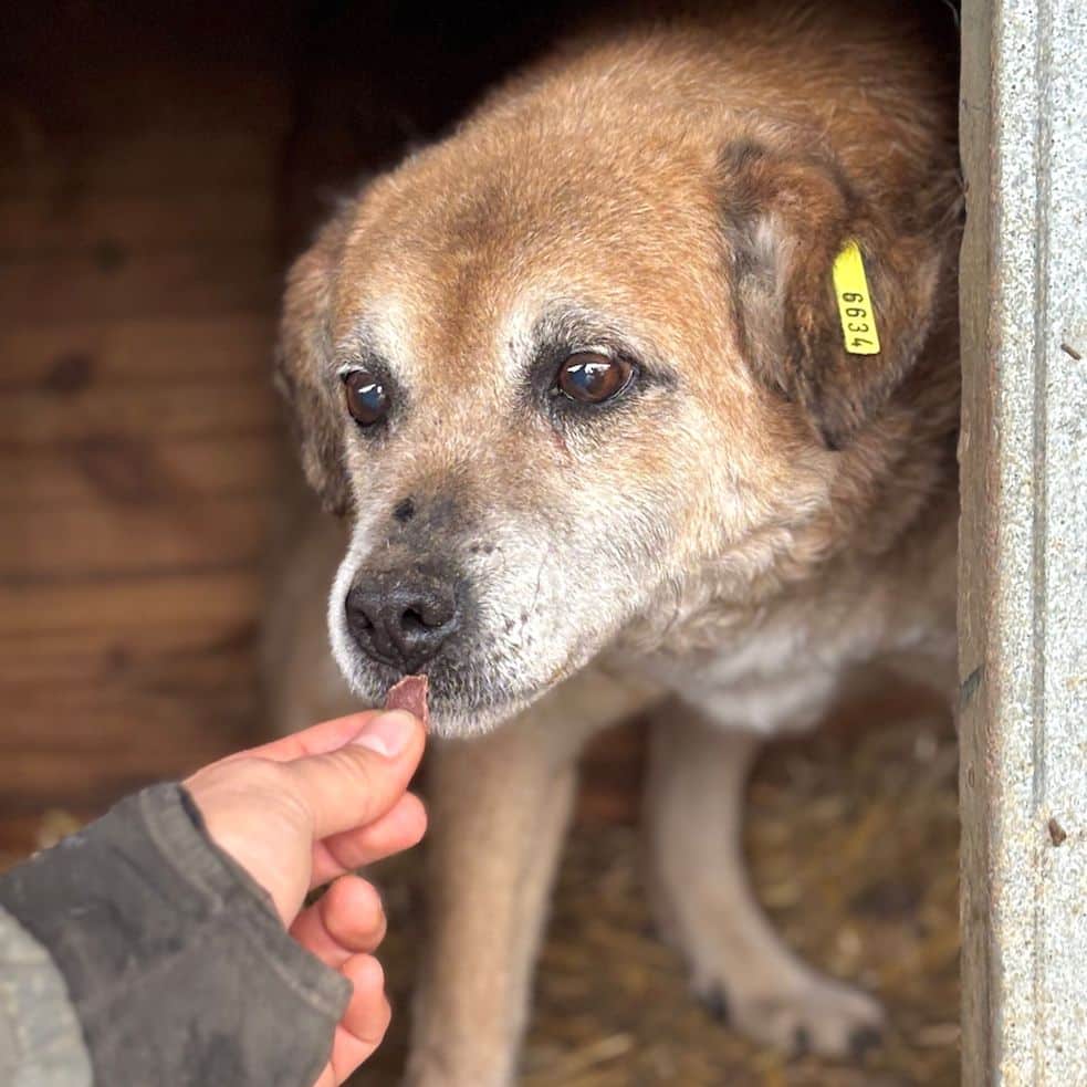 MAJARA machte einen sehr verwirrten Eindruck auf uns, evtl. hat sie Probleme mit den Augen oder beginnender Demenz. Sicher können wir es nicht sagen, jedoch war sie bei unserem Besuch erst nur in der Hütte. Sie nahm dort unsere Leckerlies aus der Hand, bellte aber und drohte auch einmal, als wir uns ihr annähern wollten. Dann nahm MAJARA wieder Leckerlies und bellte weiter, auch ohne Annäherungsversuch unsererseits. Wir konnten sie daher nicht anfassen. Zwischendurch nahm sie wieder Leckerlies aus der Hand. Es kann natürlich sein, dass sie aus der Unsicherheit uns Menschen gegenüber aufgebracht war, aber in Verbindung mit ihrem Alter erschien uns ihr Verhalten komisch und wir vermuten einen Auslöser wie Demenz dahinter. MAJARA sollte einen Platz bei (mit älteren/kranken) Hunden erfahrenen Menschen finden dürfen, wo man sich ihrer annimmt.