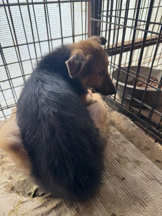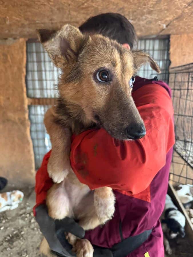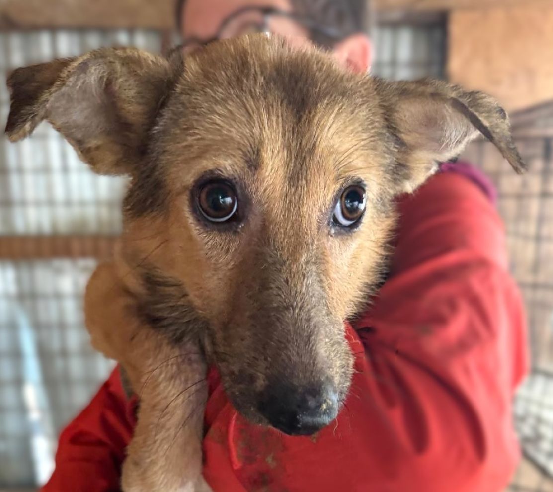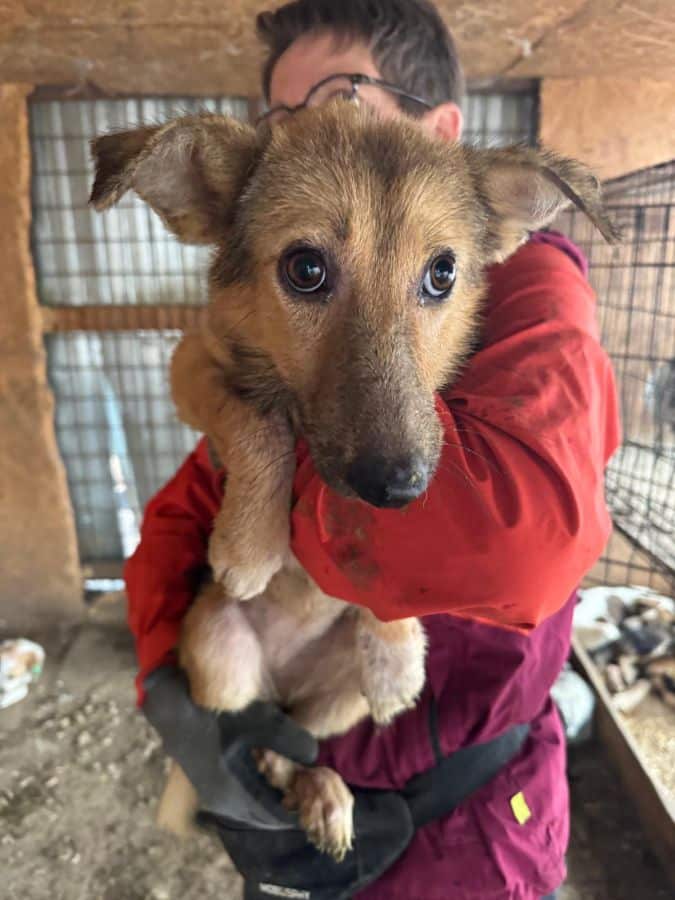 Diese Hündin saß ganz allein in einer Box. Sie ließ sich problemlos herausheben, anfassen und streicheln. Sie zeigte sich freundlich und kooperativ, trotz ihrer aktuellen gesundheitlichen Situation.