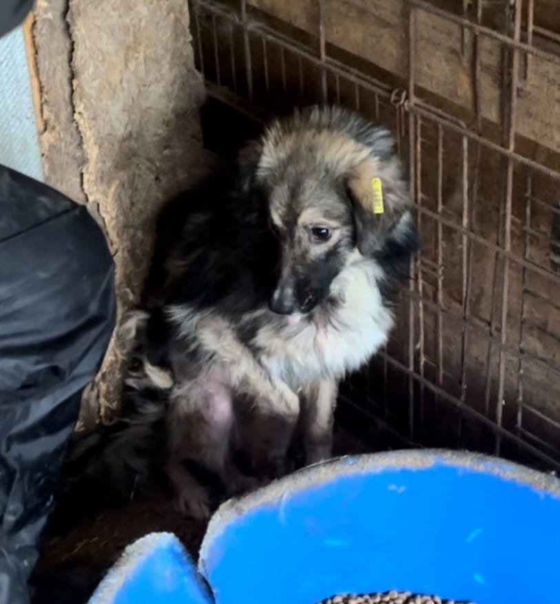 Dieser junge Rüde drückte sich bei unserem Besuch zunächst schutzsuchend in die Hütte. Sofort fiel uns auf, dass ihm stellenweise das Fell ausgegangen und er bis auf die Knochen abgemagert ist…