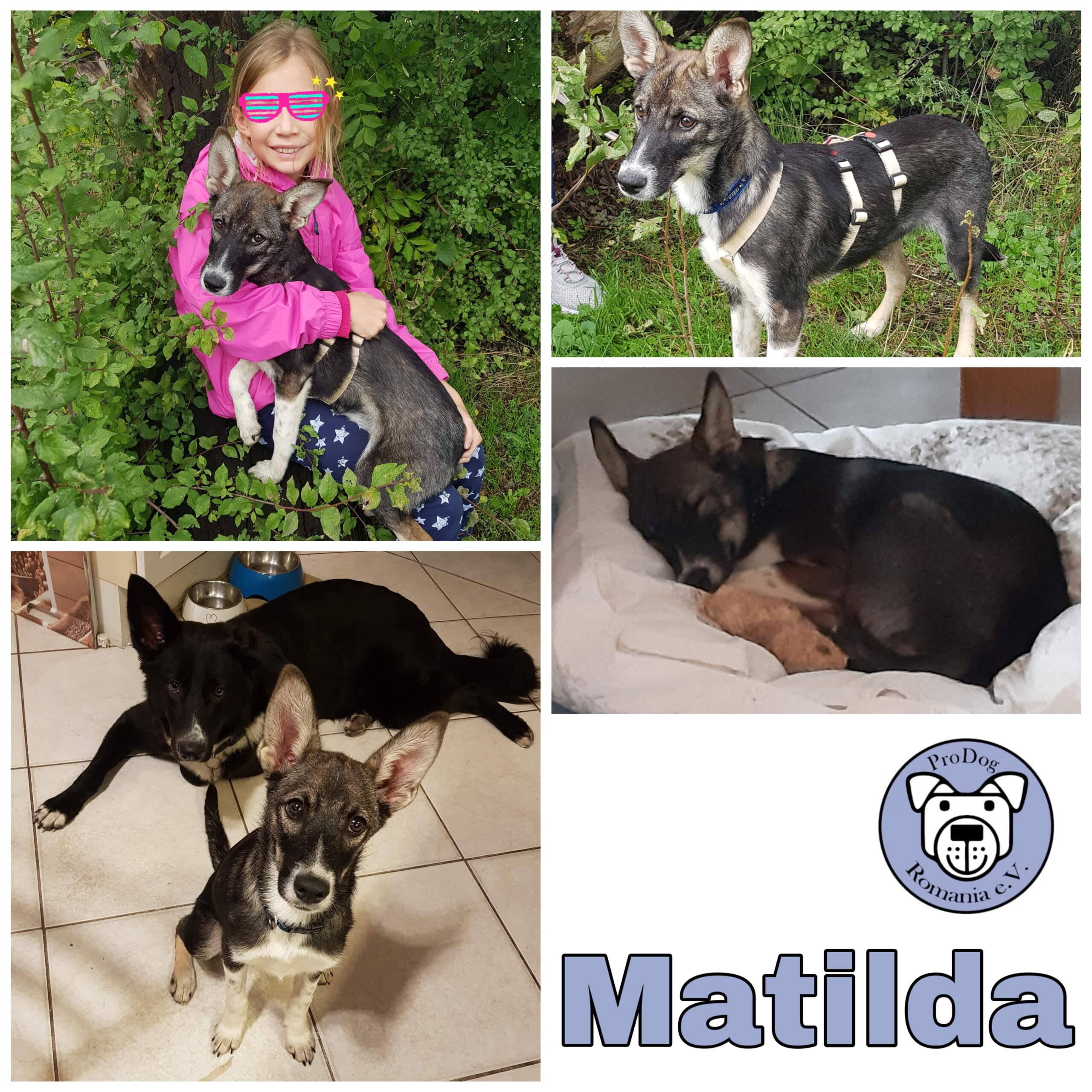 Matilda ist nun seit Anfang Oktober 2022 in Deutschland und hat schon so viel gelernt! Schnell konnte sie Treppen steigen, freundete sich gleich mit den Kindern an und erkundete das ganze Haus. Sie geht gerne Gassi, auch längere Runden bereiten ihr große Freude. Sie läuft schon gut an der Leine. Mit der Stubenreinheit klappt es ziemlich gut, wenn man sie regelmäßig nach draußen bringt. Sie ist junghundetypisch verspielt, kann hüpfen wie ein Flummi und sausen wie ein geölter Blitz. Sie liebt es, wenn man sich mit ihr beschäftigt.