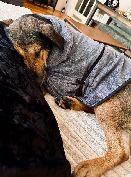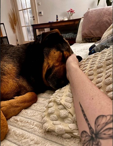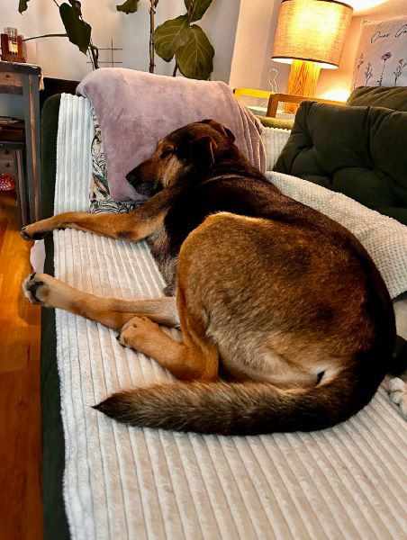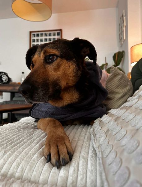 Die große Maus ist Zuhause total gechillt, macht das Homeoffice perfekt mit, wedelt einen freudig an und freut sich zwischendurch über jede Streicheleinheit. Beim Tierarzt war sie sehr tapfer und hat alles gut machen lassen. Autofahren und Treppensteigen klappt auch schon. Sie entwickelt sich hier gerade zu genau der Traumhündin, die wir als Pflegestelle in ihr gesehen haben.