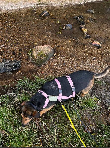 Draußen bei den Gassirunden merkt man, dass sie vorher wohl noch keinen Menschen “an sich dran hängen” hatte, da sie durch Büsche und Hecken läuft, wenn man sie lässt. Sie ist aber, trotz ihrer Größe, ziemlich leichtführig und reagiert sehr gut auf leichten Zug an der Leine (ohne dabei Angst zu haben) und zieht selbst nicht an der Leine. Sie genießt es sichtlich, durchs Gras zu laufen, schnüffelt ausgiebig und ist ansonsten einfach gemütlich unterwegs. Wasser – bisher nur in einem kleinen Bach getestet – findet sie auch gut! Geschirr und Halsband lässt sie sich geduldig anziehen, als hätte sie nie etwas anderes gemacht.
