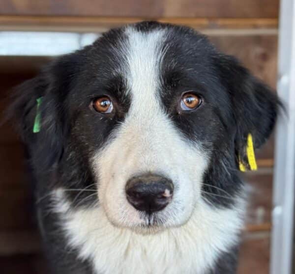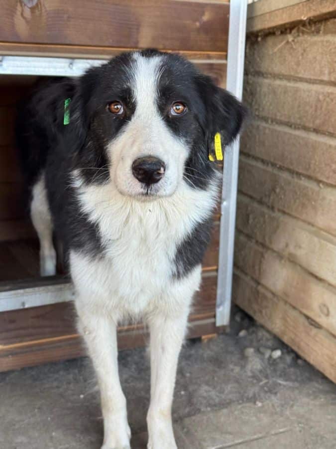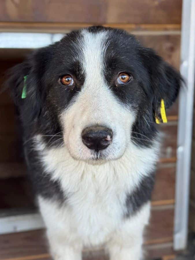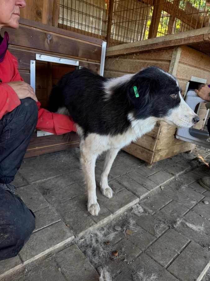 MIMMIE sitzt zusammen mit Rüden und Hündinnen in einem Kennel und scheint dort verträglich zu sein. Zunächst beobachtete sie uns von einer Ecke hinter der Hütte aus, als wir den Kennel betraten.