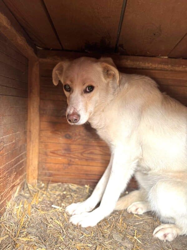 Die süße Miss Ellie ist leider immer noch die schüchternste Hündin aus ihrem Kennel. Sie kommt selbst nicht aus ihrer Spirale heraus und bräuchte dringend Menschen mit Erfahrung im Umgang mit unsicheren Hunden und mindestens einem Ersthund. Sie sitzt bei unserem Besuch leider nur in ihrer Hütte, mag ihr jemand zeigen, wie schön das Leben sein kann?