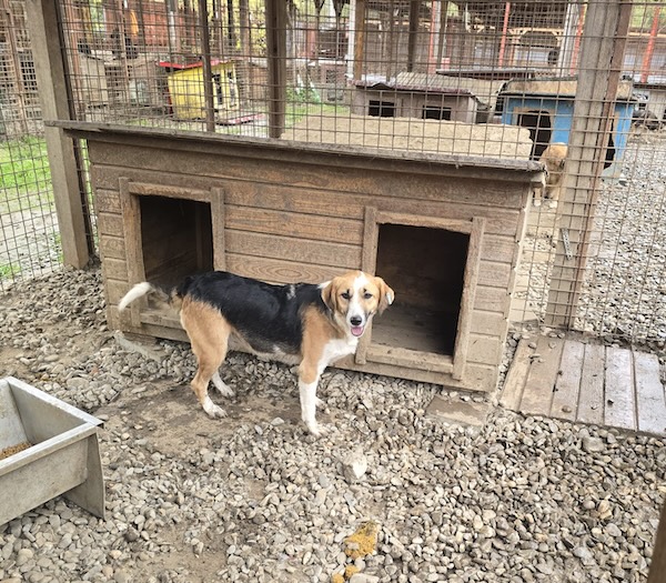 MORA zeigt sich im Außenkennel super neugierig, aber auch unsicher – immer wieder sucht sie die Nähe, nach Möglichkeit weicht sie aber aus, wenn man sich auf sie zu bewegt