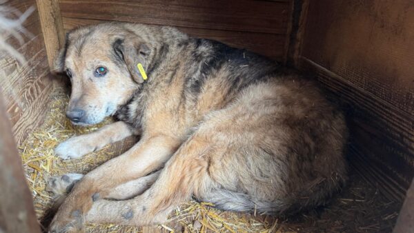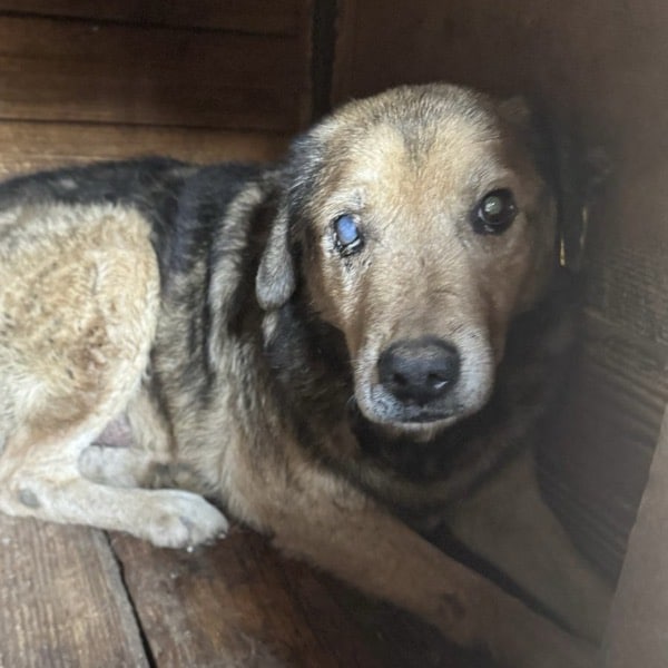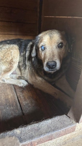 Mozzie hat leider stark abgebaut. Sein rechtes Auge ist stark entzündet, womöglich ist er darauf bereits blind. Er hat starke Hautprobleme und läuft schwerfällig. Er wirkt abgekämpft und müde, bei unserem Besuch kam er zunächst gar nicht aus der Hütte. Wir konnten ihn diesmal in der Hütte vorsichtig streicheln. Dennoch ist er dem Menschen gegenüber weiterhin unsicher. Wir hoffen sehr, dass er einen erfahrenen Platz findet, der sich ihm annimmt.