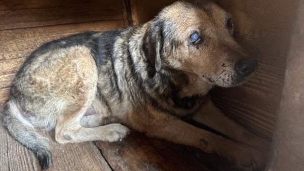 Rechtes Auge stark entzündet, evtl. blind; starke Hauptprobleme; läuft schwerfällig