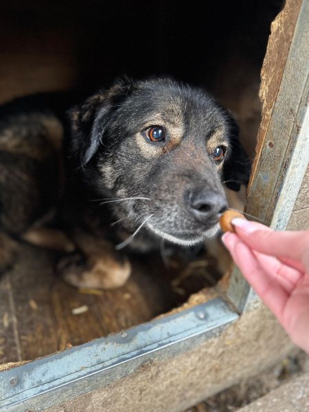 MR SMITH ist aktuell zu dick, er freute sich über unsere Leckerlis. Er ist zurückhaltend, lies sich aber noch in der Hütte an der Schnute anfassen.