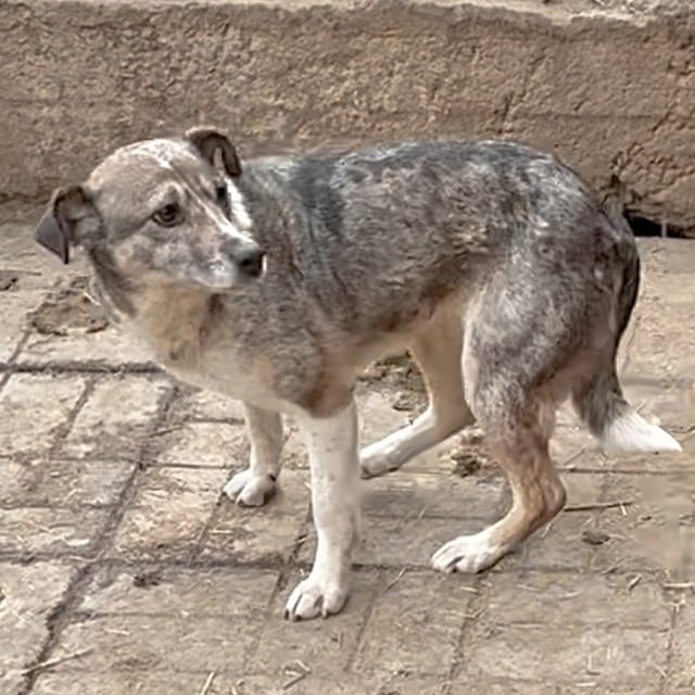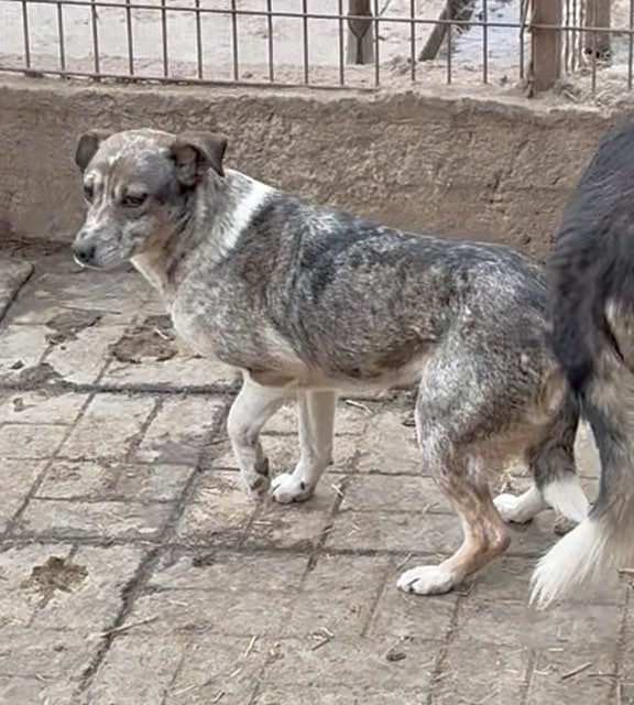 Diese kleine Hündin mit dem wunderschönen gescheckten Fell scheint neu im Shelter zu sein und ist noch völlig überwältigt von ihrer Situation, dem Lärm und Stress, umgeben von so vielen Hunden. So saß NAJMA zunächst zitternd zwischen den anderen Hunden in der Hütte und versuchte, sich vor uns zu verstecken… vermutlich hat sie bisher überhaupt keine Erfahrungen mit uns Menschen machen können und weiß deshalb noch nicht, dass wir es doch gut mit ihr meinen. Später saß die kleine Hundedame genauso zitternd am Zaun und wir wollten sie nicht noch mehr überfordern, indem wir sie weiter bedrängen.