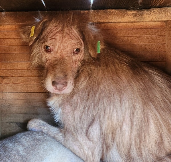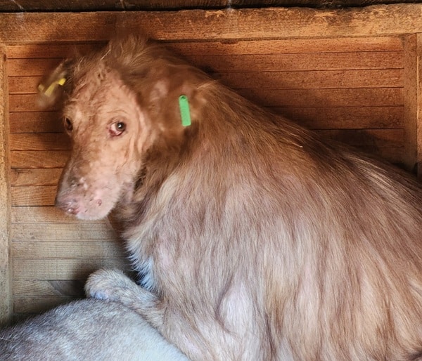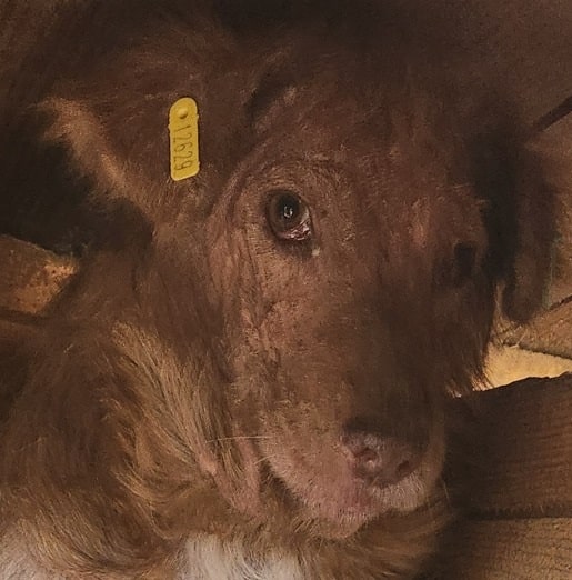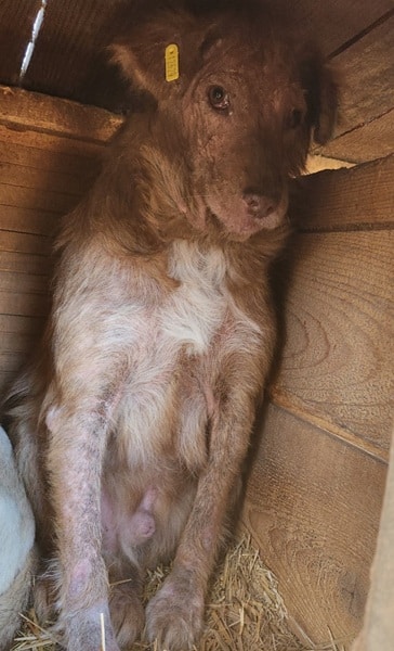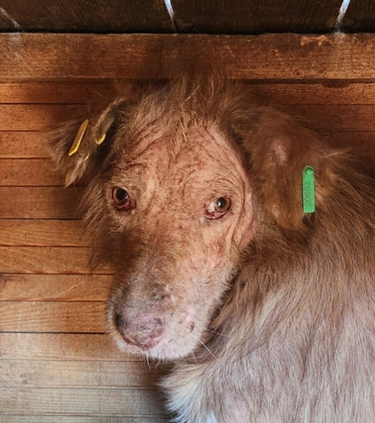Diese unfassbar arme Seele mit dem sorgenvollen Blick fanden wir aufgrund der Hautprobleme mit kargem Fell vor, sodass er dem kalten rumänischen Winter nichts entgegenzusetzen hat und somit stark gefährdet ist diese unwirtliche Jahreszeit nicht zu überleben. Verzweifelt kauerte er sich in seiner Hütte zusammen. Als wir uns ihm näherten, fiel uns auf, dass er außerdem eine sehr magere Statur hat und unter entzündeten Augen leidet. Trotz seines schlimmen Zustands ließ er sich vorsichtig von uns mit der falschen Hand streicheln und seinen Chip auslesen. Er versuchte zögerlich auszuweichen, zeigte dabei aber kein Abwehrverhalten. Ein wirklich herzzerreißender Anblick, wir hoffen sehr, dass dem armen Hund geholfen werden kann!