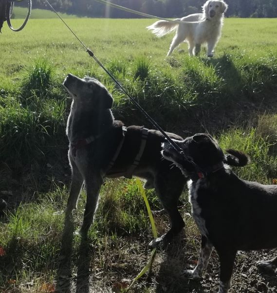 Beim Spaziergang ist die Schleppleine noch dran, aber eigentlich wird sie nicht gebraucht, denn Odie bleibt immer bei der Gruppe (von kleinen Ausbruchsversuchen zu den Kuhfladen mal abgesehen