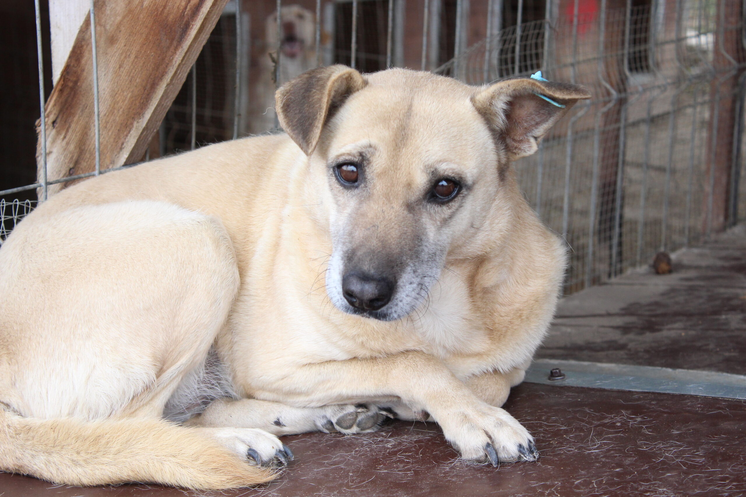 OHANA ist leider wieder ängstlicher geworden. Ein großer Rüde in ihrem Kennel buttert sie zudem unter, sodass sie sehr unsicher war, als wir sie besucht haben.