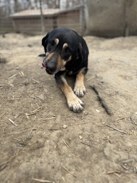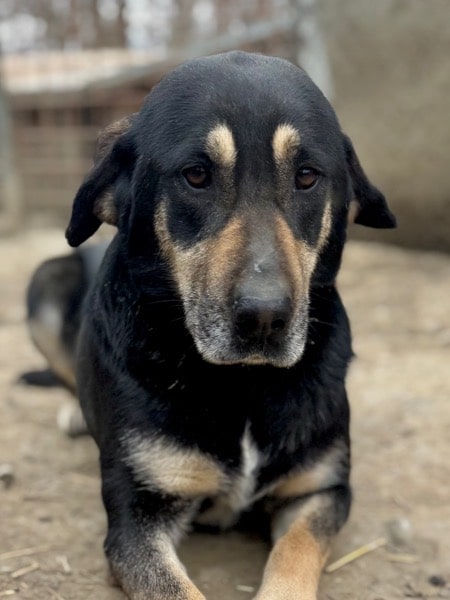 Dieser junge schwarze Rüde mit dem tollen braunen Abzeichen hat uns anfangs aus sicherer Entfernung beobachtet, bevor er sich entspannt niederließ und nach kurzer Überlegung die Streicheleinheiten mehr und mehr zuließ. Ein ganz feines, vom Wesen her zartes Kerlchen, das definitiv Potential für mehr hätte.