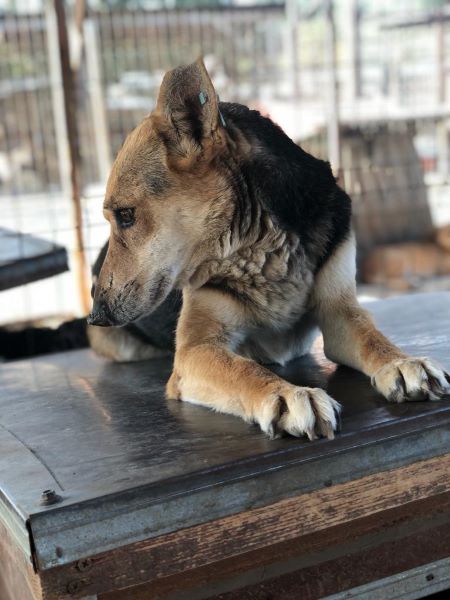 Nach seiner Ohrmarke zu urteilen, lebt er schon viele Jahre in Bucov. Bei unserem Besuch zeigte er keinerlei Interesse an uns. Keine Panik, sondern wich unserem Blick durchgehend aus. Sein Hüttendach verließ er auch unter Bedrängung nicht. Bei Anfassversuchen wich er ohne Abschnappversuche aus. Die anderen Hunde im Kennel waren noch scheuer, so dass wir ein Zusammenspiel nicht beobachten konnten. Das Hüttendach war sehr rutschig, aus diesem Grund können wir zu seinem Gangbild keine konkrete Aussage geben.